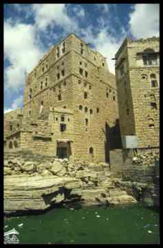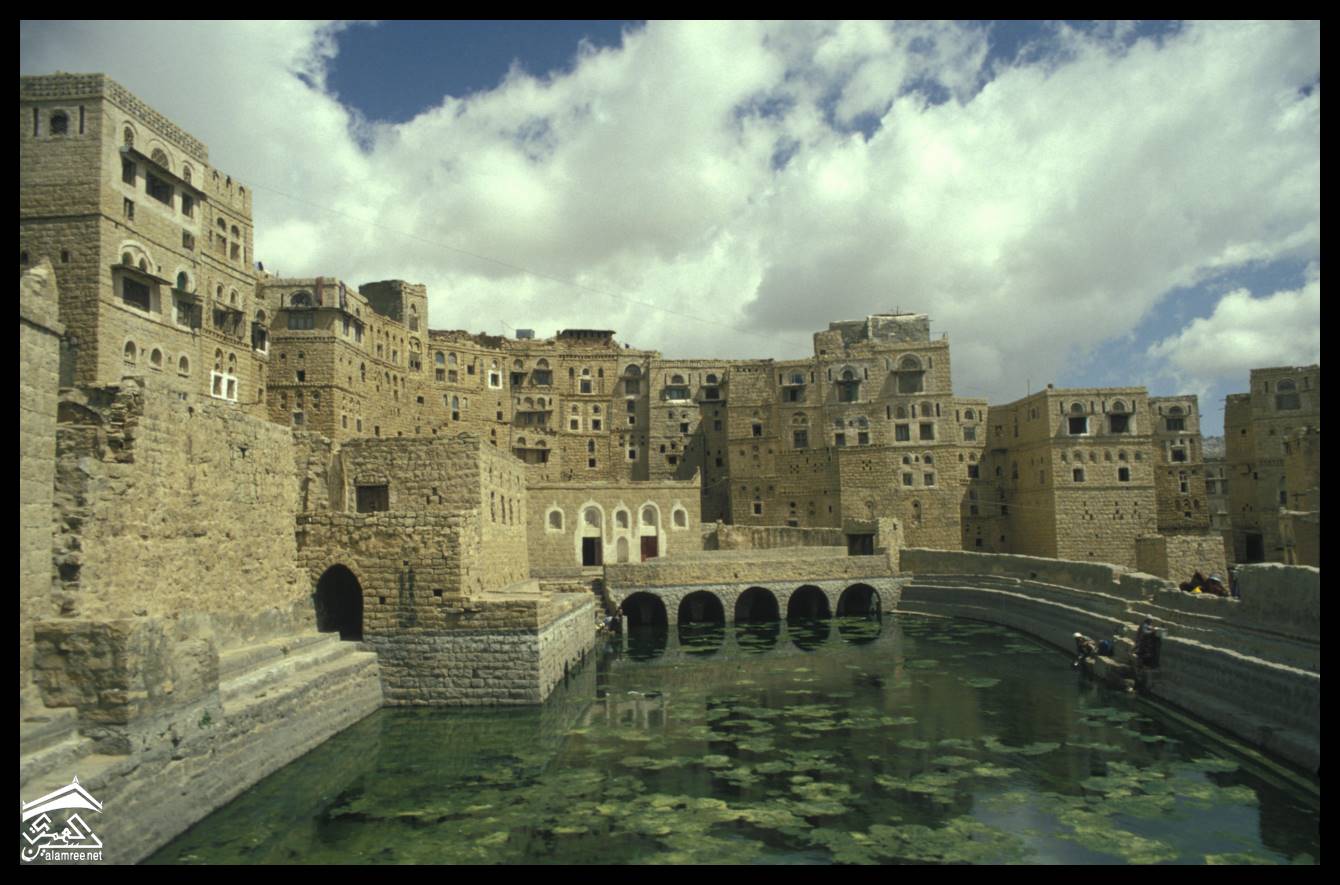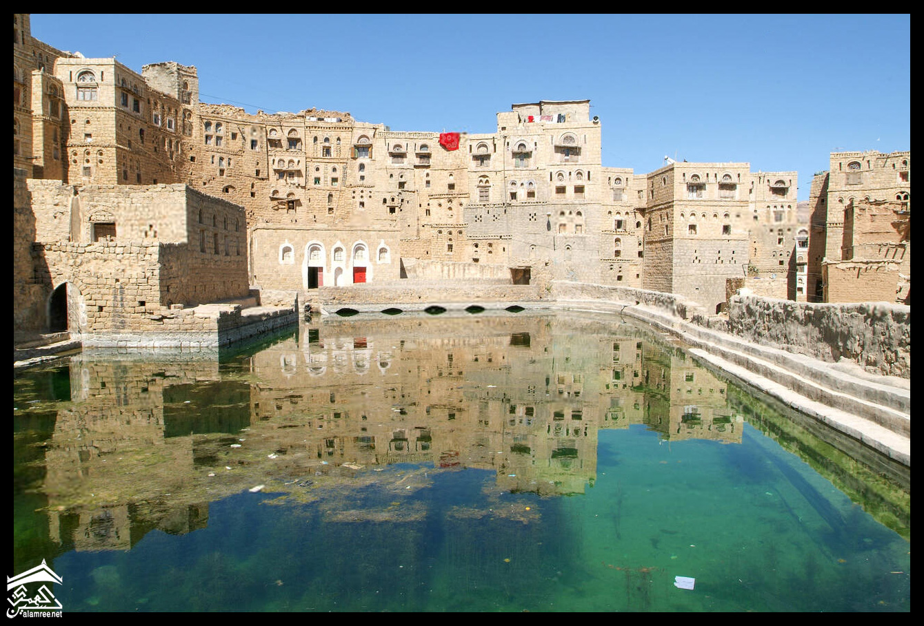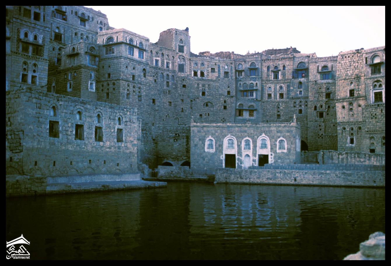 اليمن – الحبابة – واجهات منازل تطل على صهريج في المركز التاريخي