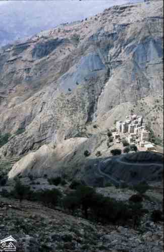 منظر عبر حجة، مع مجموعة من الأطفال يجلسون على نتوء في المقدمة. ترتفع منحدرًا إلى اليمين بعض تحصينات قلعة القاهرة التي تحيط بالقصر. أمامك مباشرة توجد مستوطنة على قمة تل، بها شرفات متدرجة تغطي منحدرات خضراء شديدة الانحدار. تظهر مستوطنة أخرى في واد عميق على يسار الصورة. الجبال ترتفع في الخلفية. تتكون مجموعة الأطفال من تسعة فتيان وفتيات بأعمار مختلفة