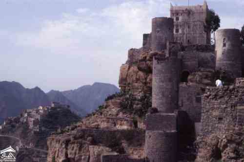 منظر لقلعة القاهرة والقصر القديم بحجة. تم بناء التحصينات على سفح الجبل شديد الانحدار، ويظهر في الأعلى مبنى، وهو جزء من القصر القديم. تظهر مستوطنة أخرى على قمة تل إلى اليسار، مع مصاطب متدرجة تملأ المنحدرات الخضراء شديدة الانحدار. الجبال ترتفع في المسافة