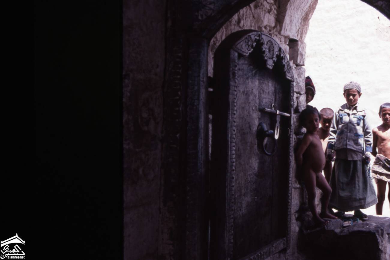 مجموعة من الأطفال، عراة وملابس، يقفون في أحد أبواب مدينة جبلة. يتم مشاهدتها من داخل المبنى، من خلال باب مفتوح. |