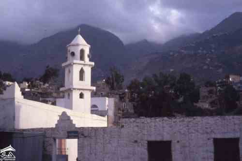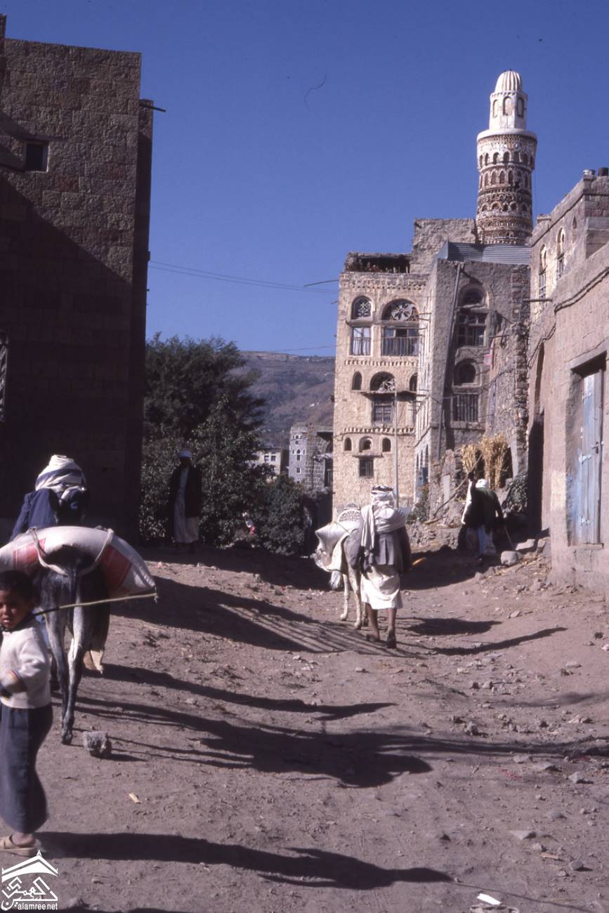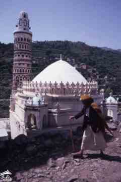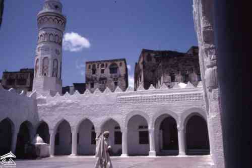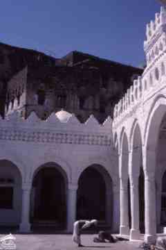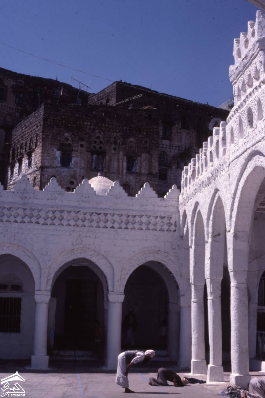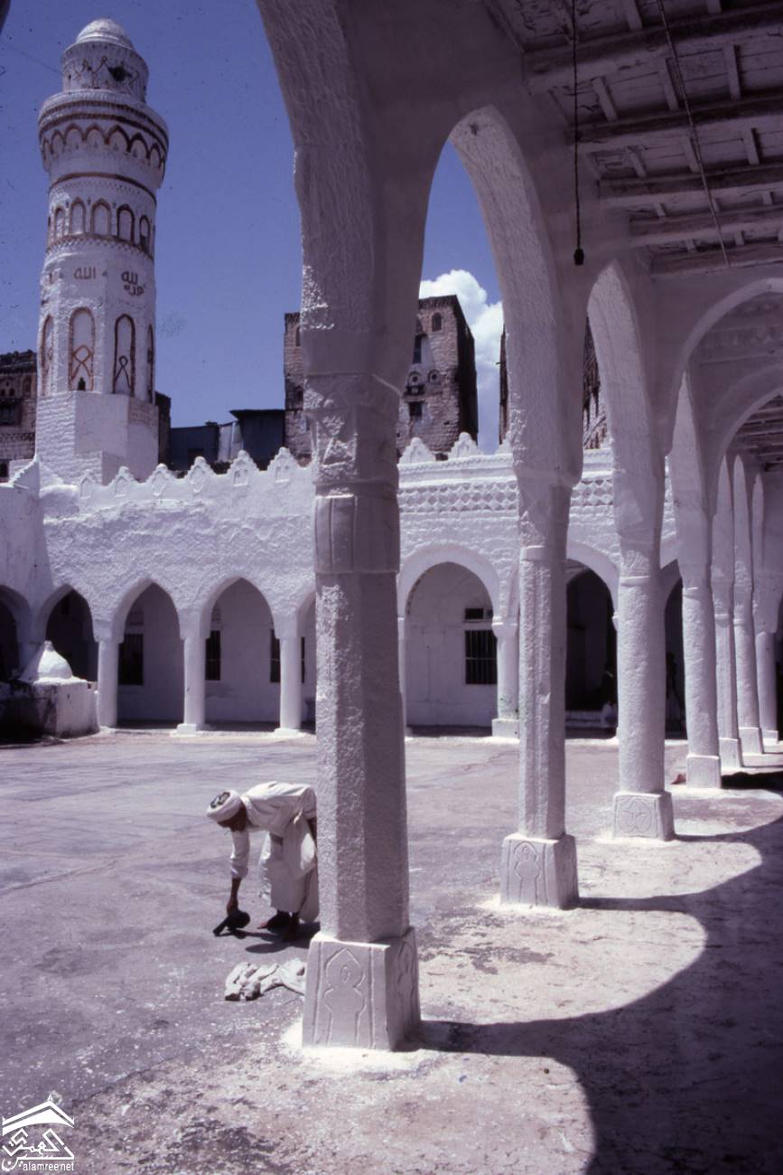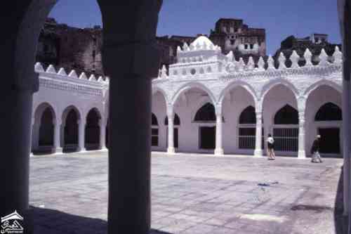 منظر للفناء والمئذنة في مسجد الملكة أروى. يحيط بالفناء رواق مقوس من الجص الأبيض، مزين جزئيًا بإفريز هندسي وتعلوه صفوف من المثلثات المتدرجة. وترتفع المئذنة الجصية البيضاء من إحدى زواياها. يتم إبراز ميزاته الزخرفية باللون البني المحمر. يقف رجل في وسط الفناء، ويطوي قطعة قماش كبيرة.