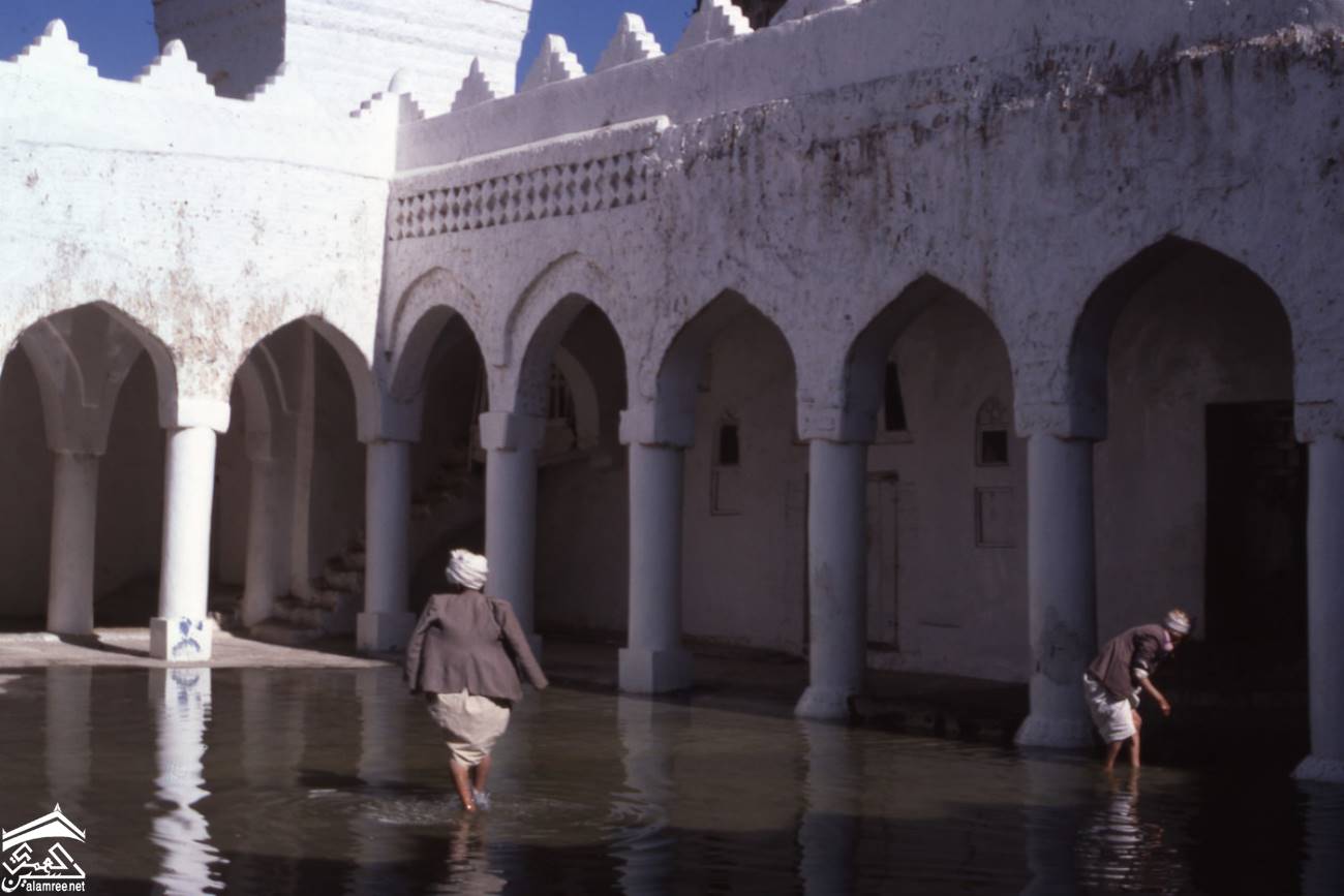 الفناء الذي غمرته المياه لمسجد الملكة أروى. يظهر جانبان من صف الأعمدة