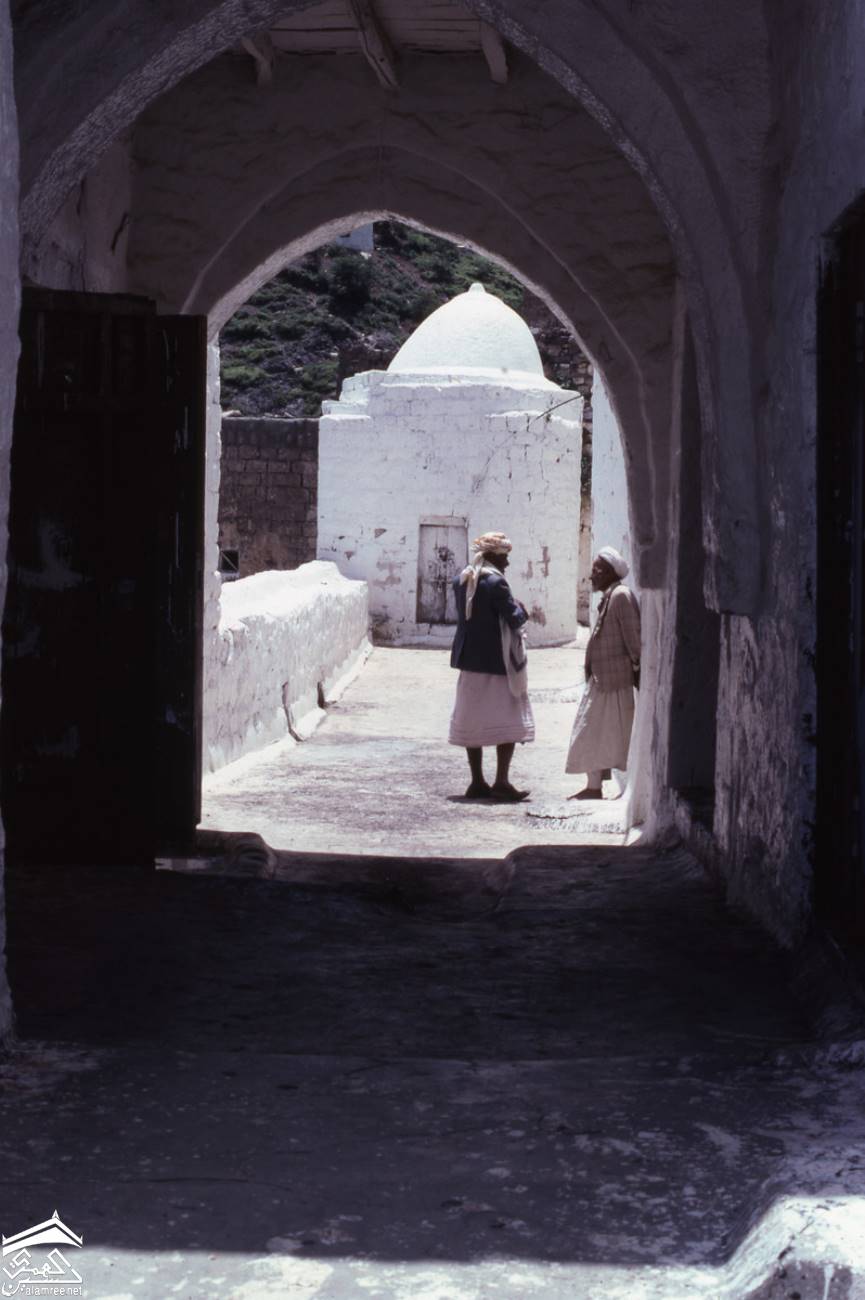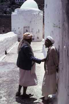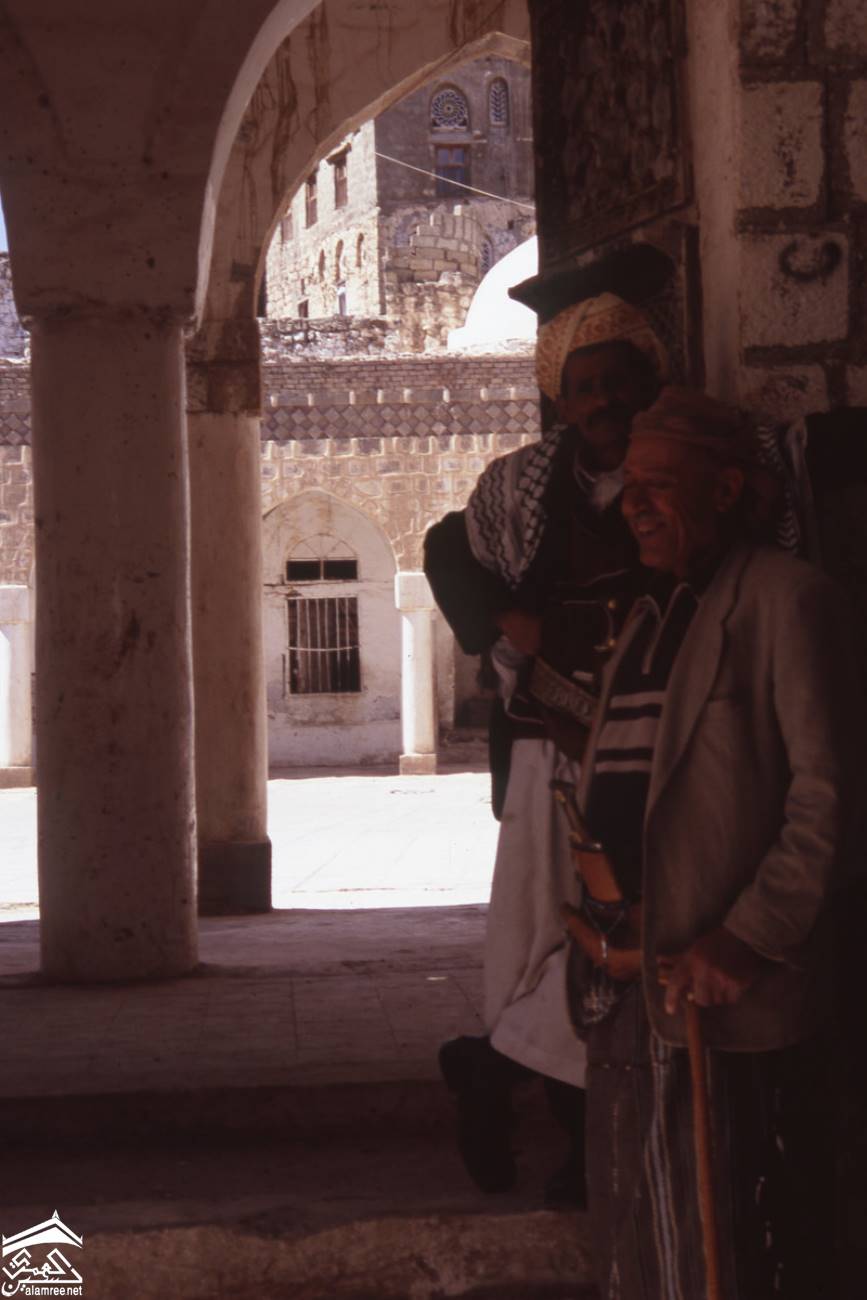 رجلان يتحدثان خارج مسجد الملكة أروى في جبلة. يقفون خارج البوابة المقوسة، ويرتدي كل منهم سترة بيضاء طويلة وسترة على الطراز الغربي وعمامة.