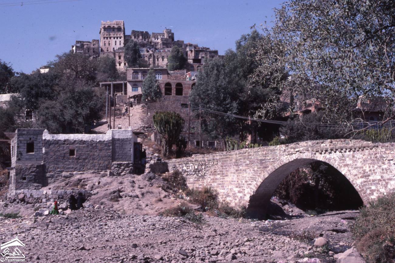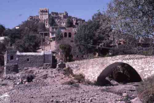 منظر لجسر جبلة. لقد تم تحويل النهر الذي تعبره إلى مجرى صغير. وعلى الجانب الآخر، يوجد طريق يؤدي إلى أعلى التل حيث تتكدس العديد من المنازل.