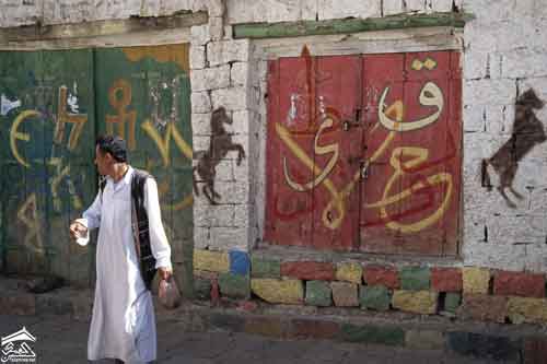 رجل يرتدي ملابس بيضاء يقف أمام جدار مطلي مزين بالشعارات والكتابات على