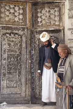 رجلان يقفان أمام أبواب منحوتة بشكل متقن في مدينة إب التجارية. ويرتدي كل منهم الخنجر اليمني التقليدي المنحني، الجنبية.