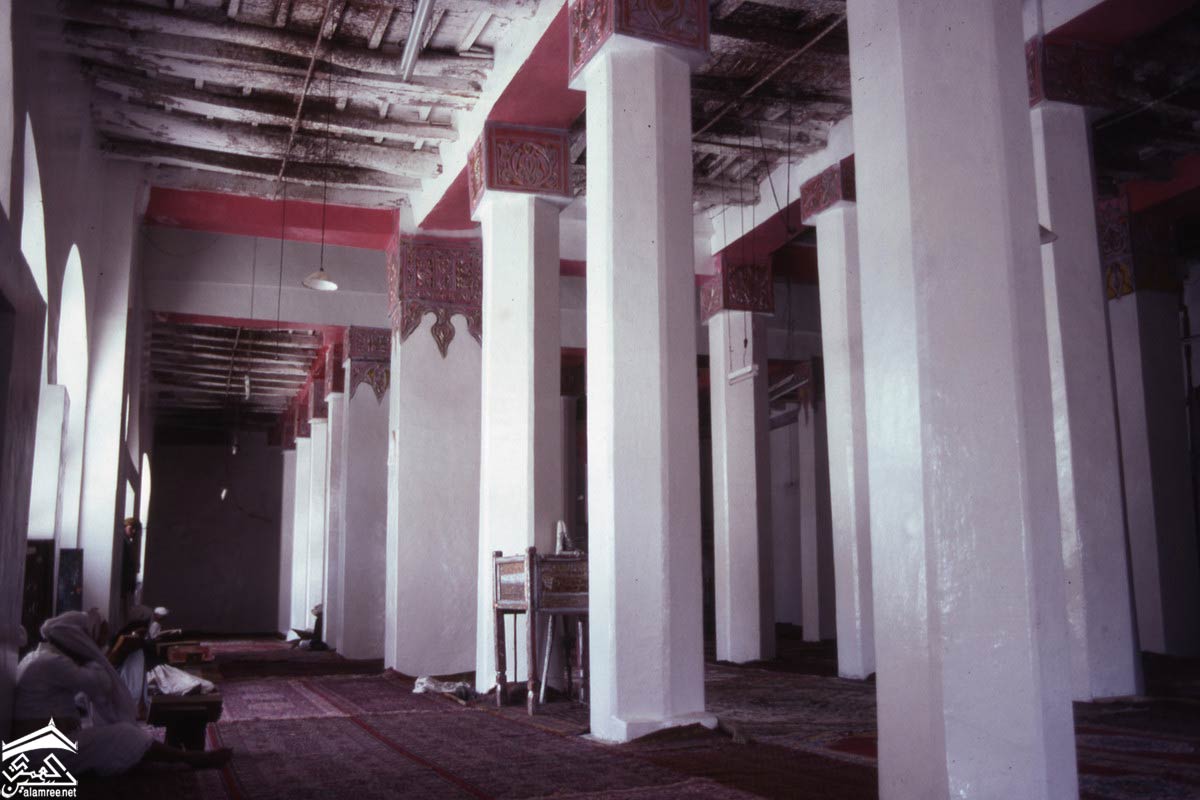 منظر داخلي لمسجد الملكة أروى بجبلة. صفوف من الأعمدة البيضاء تملأ الغرفة، مع عوارض خشبية في السقف أعلاه وسجاد مفروش على الأرض. يجلس الناس ويقرأون على الحائط على اليسار.