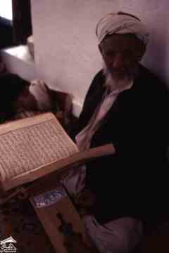رجل مسن يقرأ القرآن في مسجد الملكة أروى.