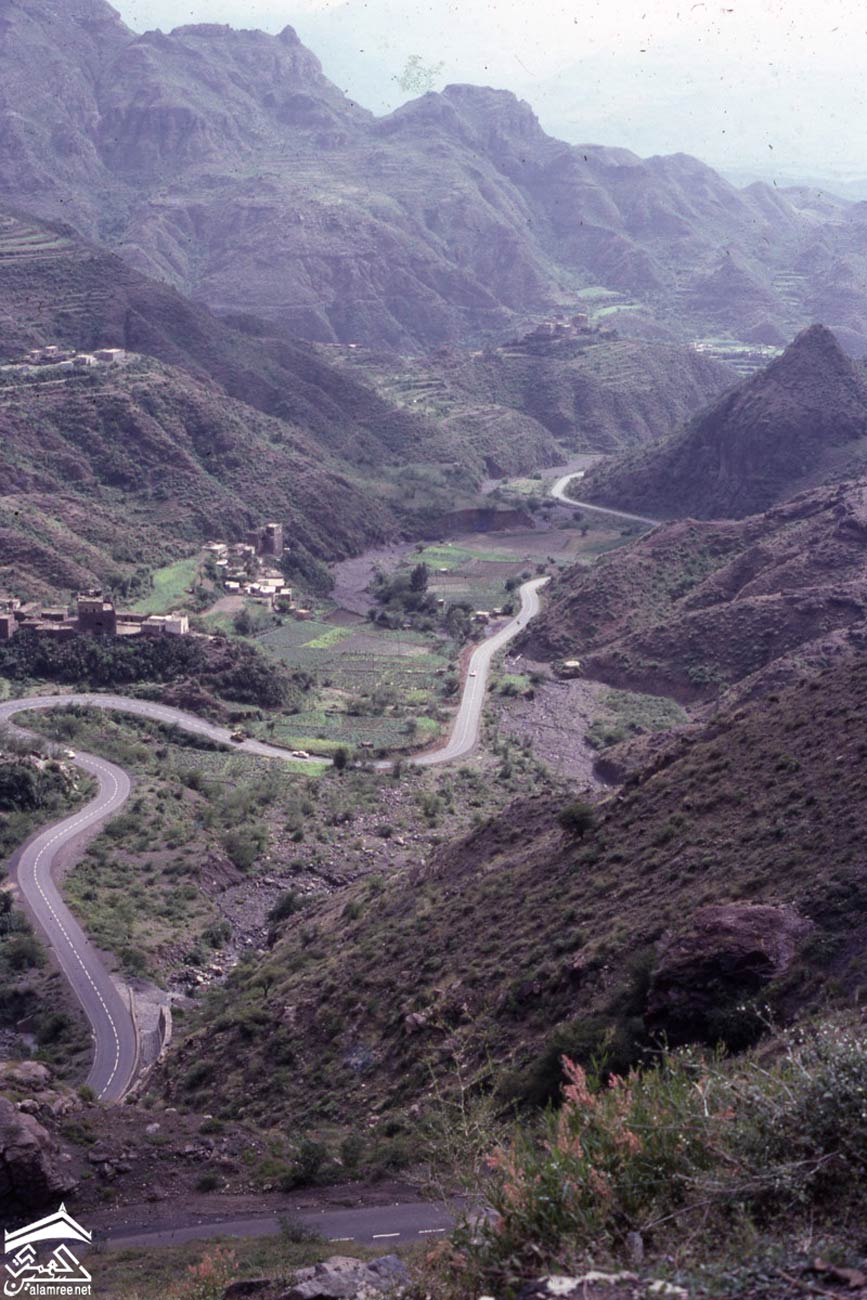 منظر للممر الجبلي بين إب وصنعاء. يمر الطريق الحديث عبر واد أخضر عميق، مع منحدرات متدرجة وقمم جبلية ترتفع على كلا الجانبين.