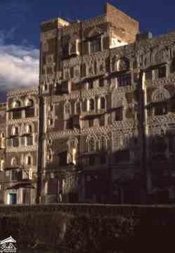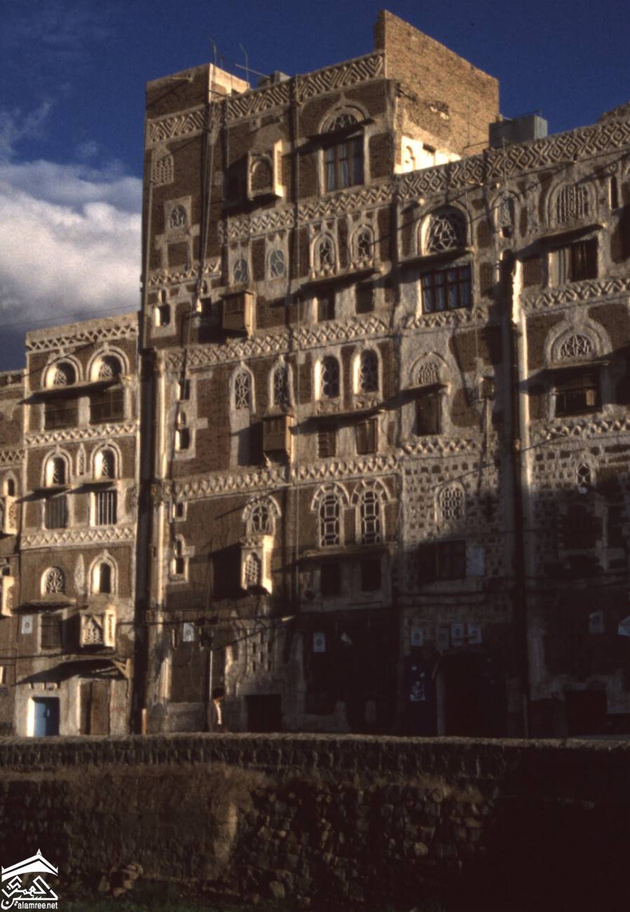 منازل متعددة الطوابق في صنعاء. تم تزيين جميع المنازل الترابية والطوبية