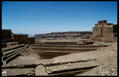 منظر لحمام سباحة في كوكبان. يمكن رؤية خطوات واسعة تؤدي إلى بركة مياه مربعة ، مع الجدران البيضاء في فناء المسجد الذي يحجب في الغالب حمام السباحة. يتم تصوير المنازل اليمنية التقليدية في الخلفية.