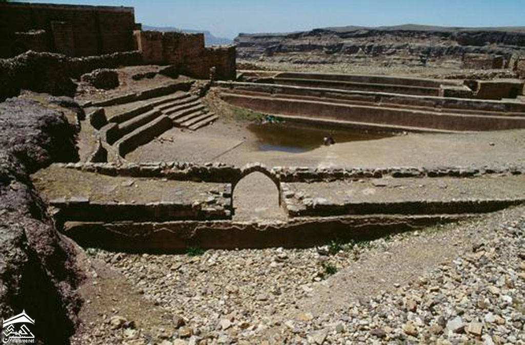 جيني بلفور بول بجانب بركة سباحة أو صهريج خارج كوكبان. خطوات واسعة تؤدي إلى الماء ، في الصورة إلى اليسار. في الخلفية يمكن رؤية جدران كوكبان المحصنة