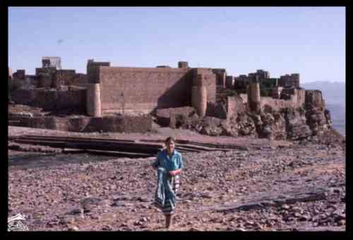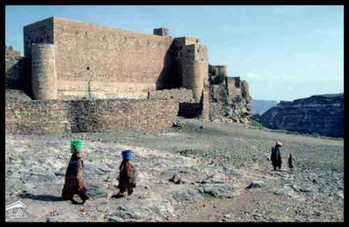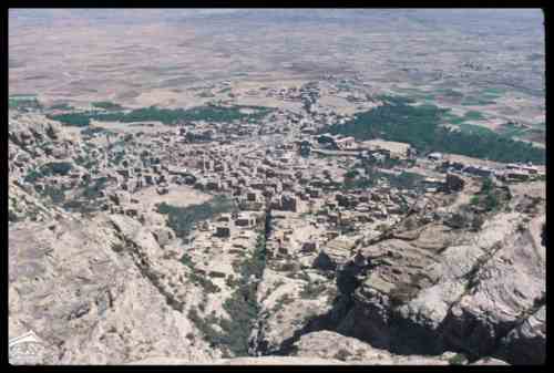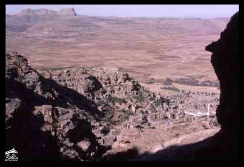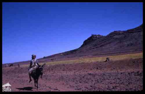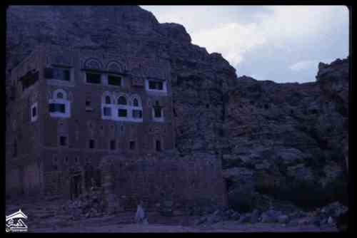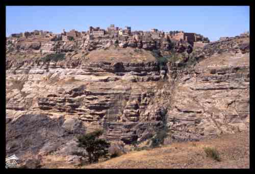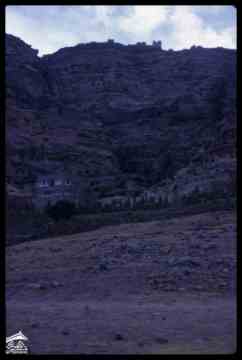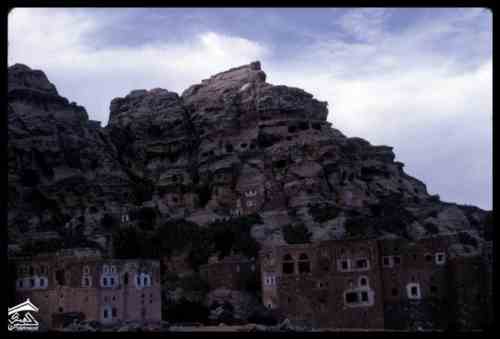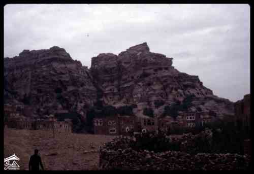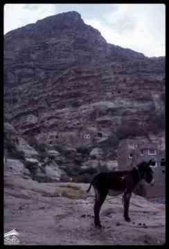 شيبام. حمار في المقدمة، مساكن البشر البدائيين على صخرةت:كلودي فاين 1969م