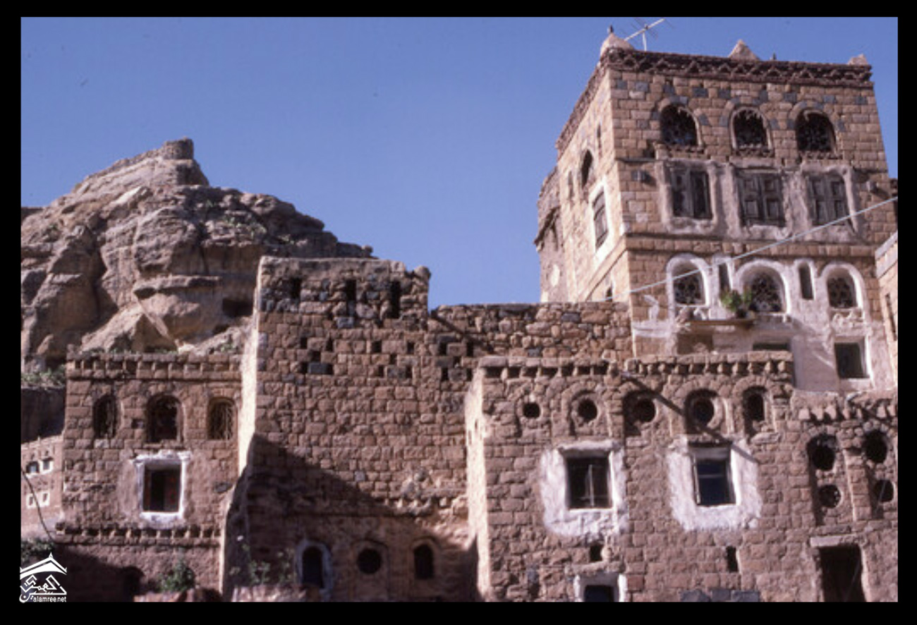 اليمن - شبام كوكبان - منزل يمني عند سفح جبل صخري تصوير كلودي
