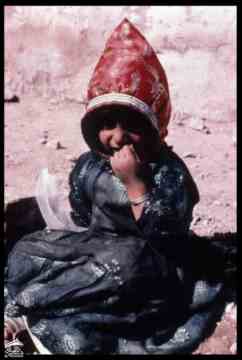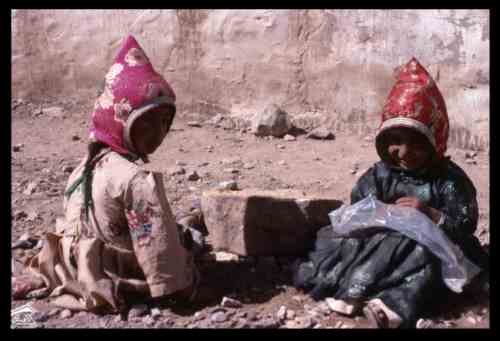 فتاتان صغيرتان تجلسان على الأرض في كوكابان. كل منهم يرتدي الفساتين والأغطية المدببة الزخرفية.