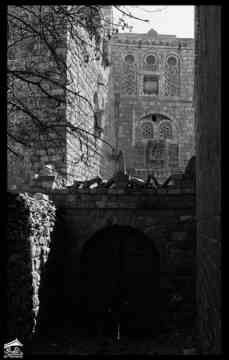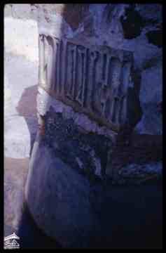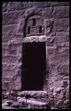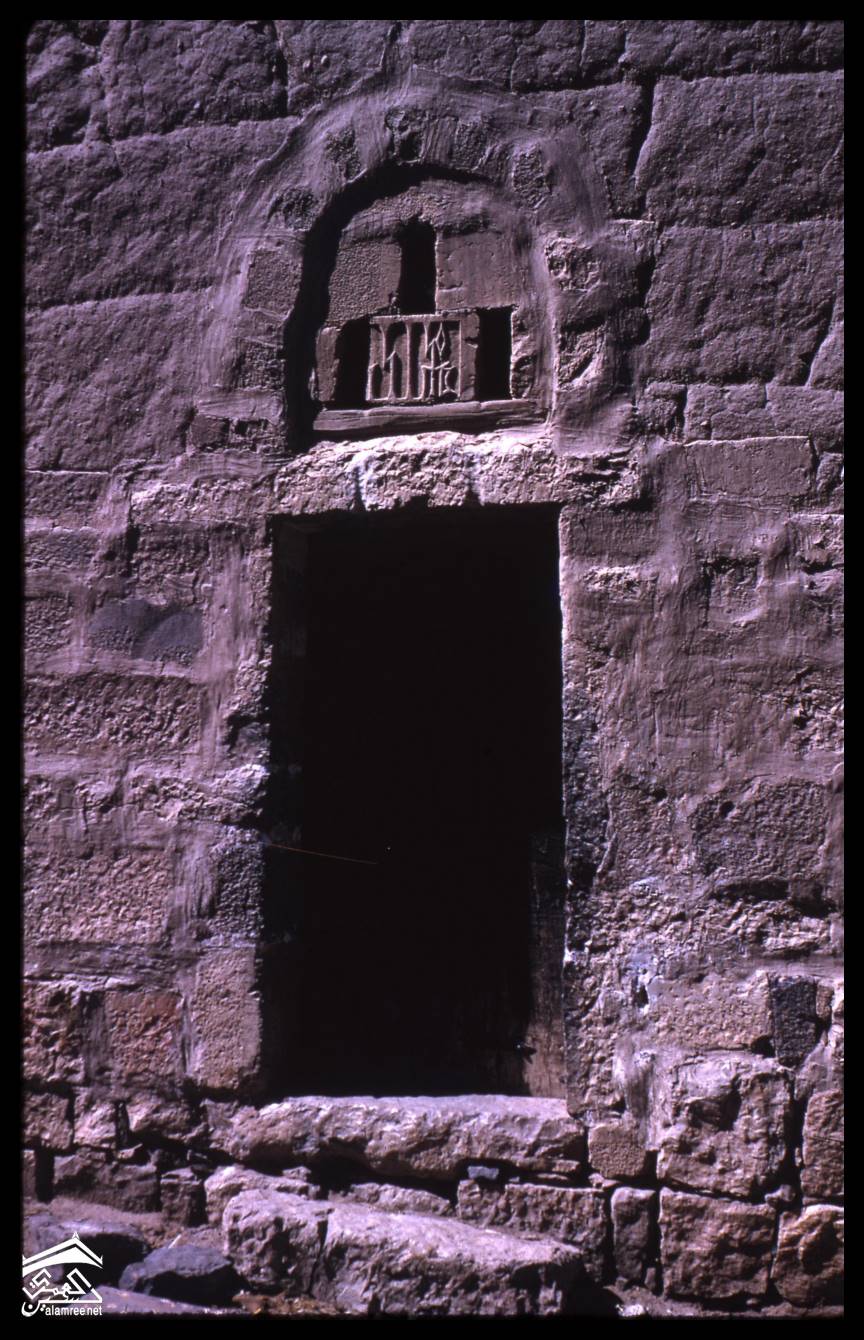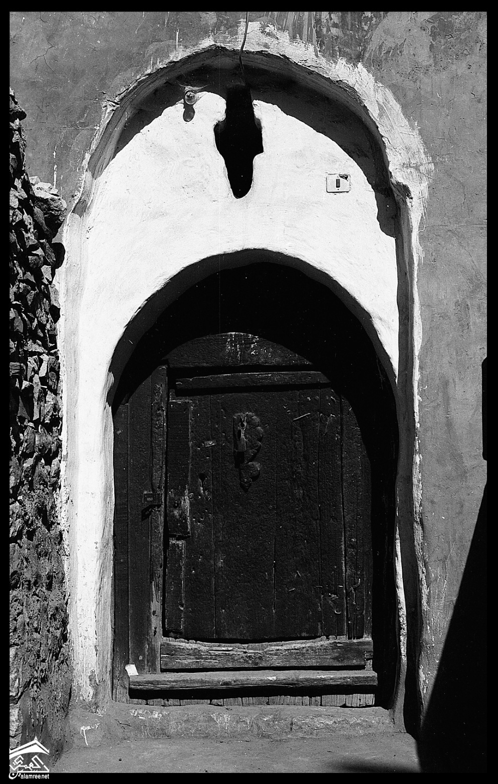 شبام كوكبان - باب خشبي يعلوه قوس ونقش باللغة السبئية تصوير جيني بلفور بول عام 1983م