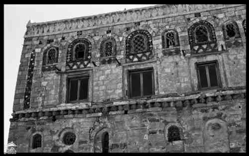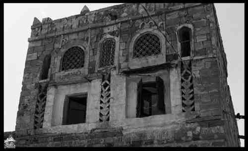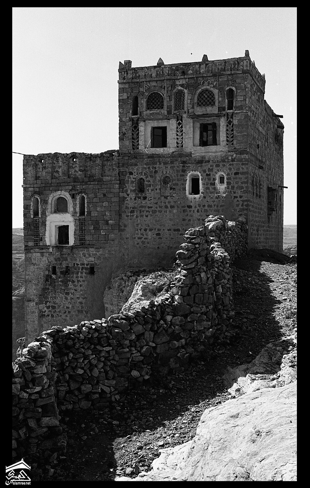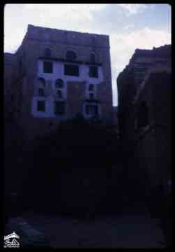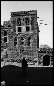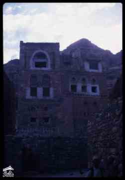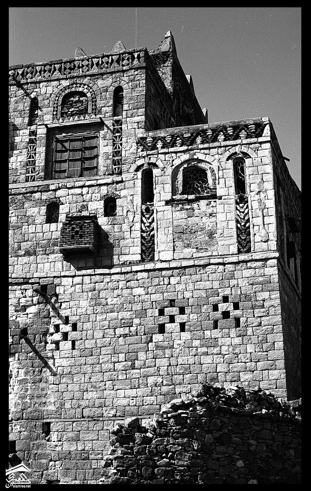 منظر للمبنى على أرض مرتفعة ، مع جدار حجري يؤدي إليه. المبنى نموذجي للهندسة المعمارية اليمنية ، حيث يحتوي على طوب زخرفي وعمل بالجص وأقواس مليئة بالزجاج المزخرف.