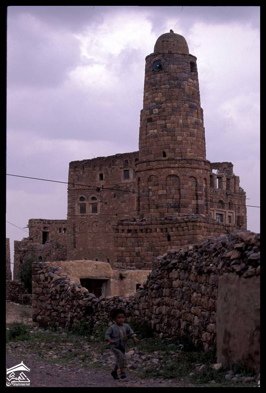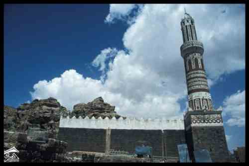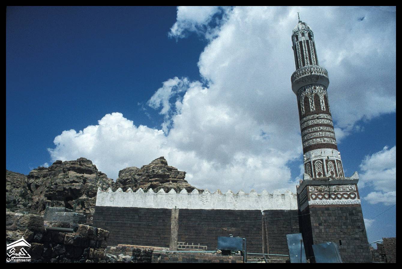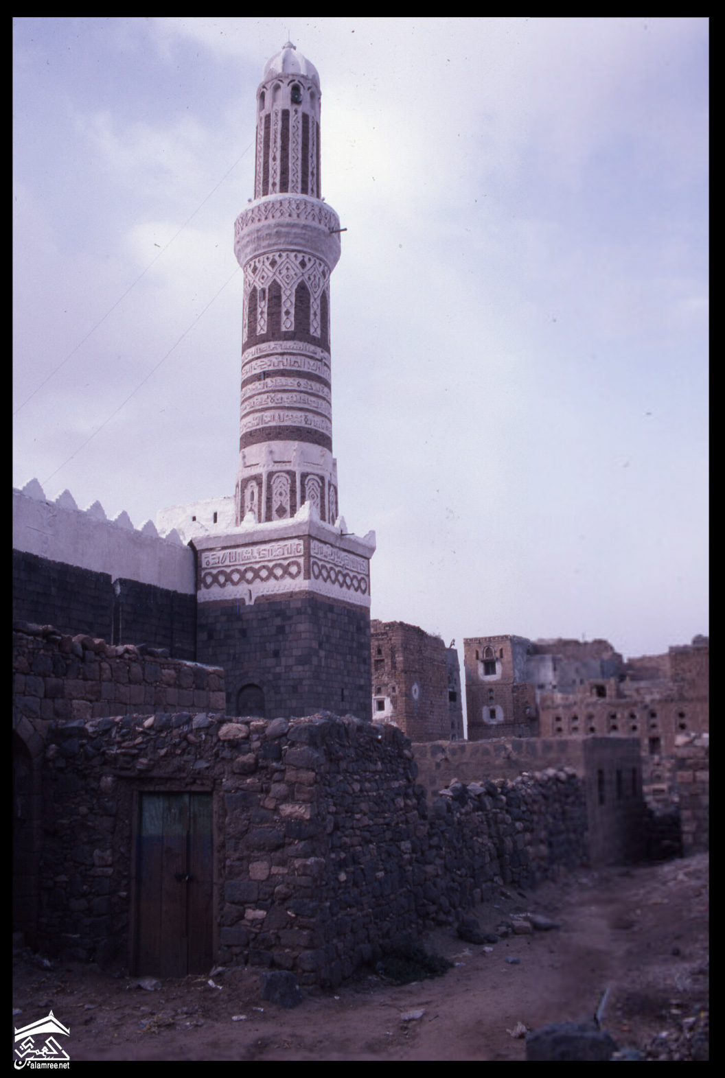اليمن - شبام - منظر خارجي للجامع الكبير ومئذنته مع نقوش تصوير بول بونينفانت عام 1996م