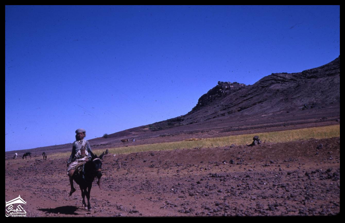 اليمن - شبام كوكبان - صبي يمني يمتطي حمارًا في أرض زراعية