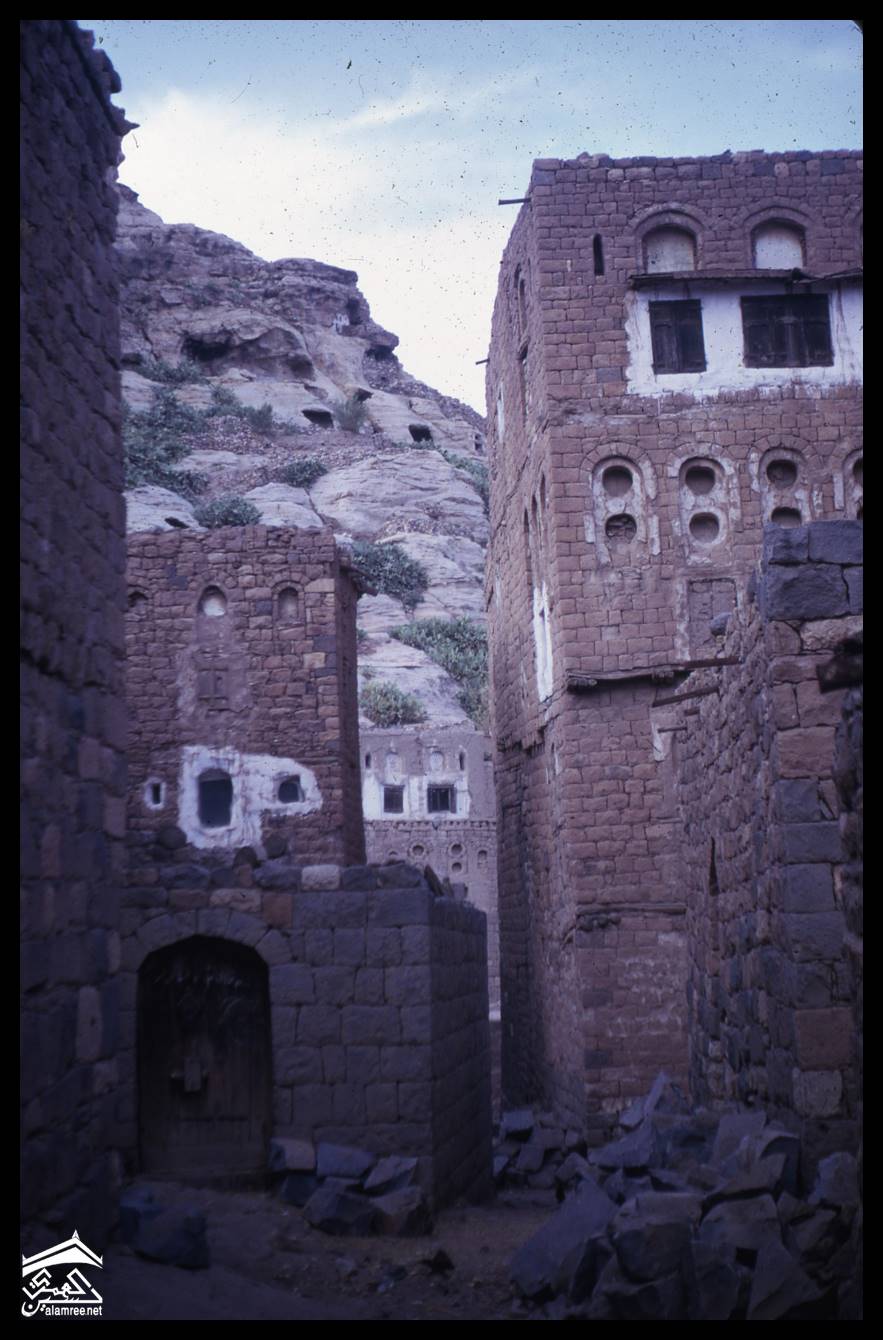 اليمن - شبام كوكبان - منظر لمنازل يمنية وكروم ترتكز على أعمدة حجرية