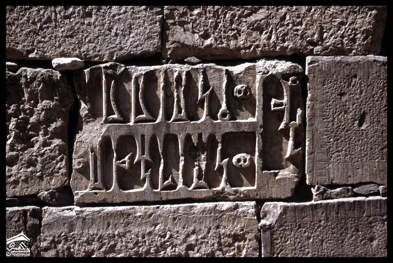 اليمن - شبام كوكبان - جدار حجري يحمل نقوشًا باللغة السبئية تصوير كلودي فاين 1969م