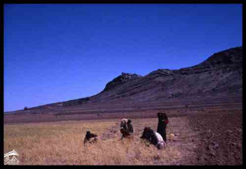 اليمن - شبام كوكبان - يمنيون يحصدون القمح في حقل