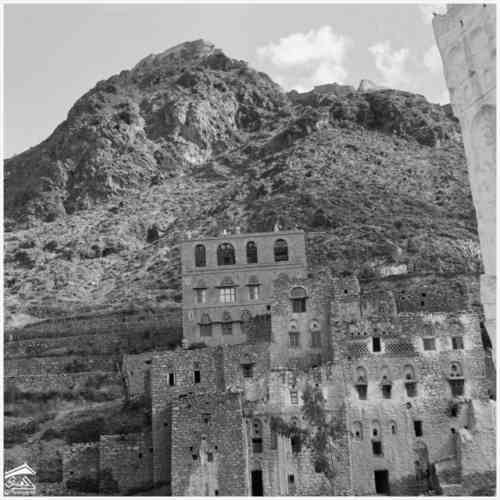 "قرية تقع على صخرة بالقرب من تعز. الحقول في السهل."