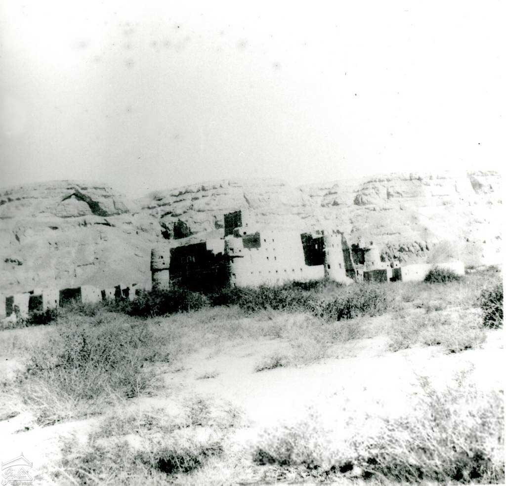 ضريح النبي هود وادي المسيلة حضرموت ويلاحظ مجمع من المباني المسورة، قبه واحدة، تحت الصخور الشاهقة