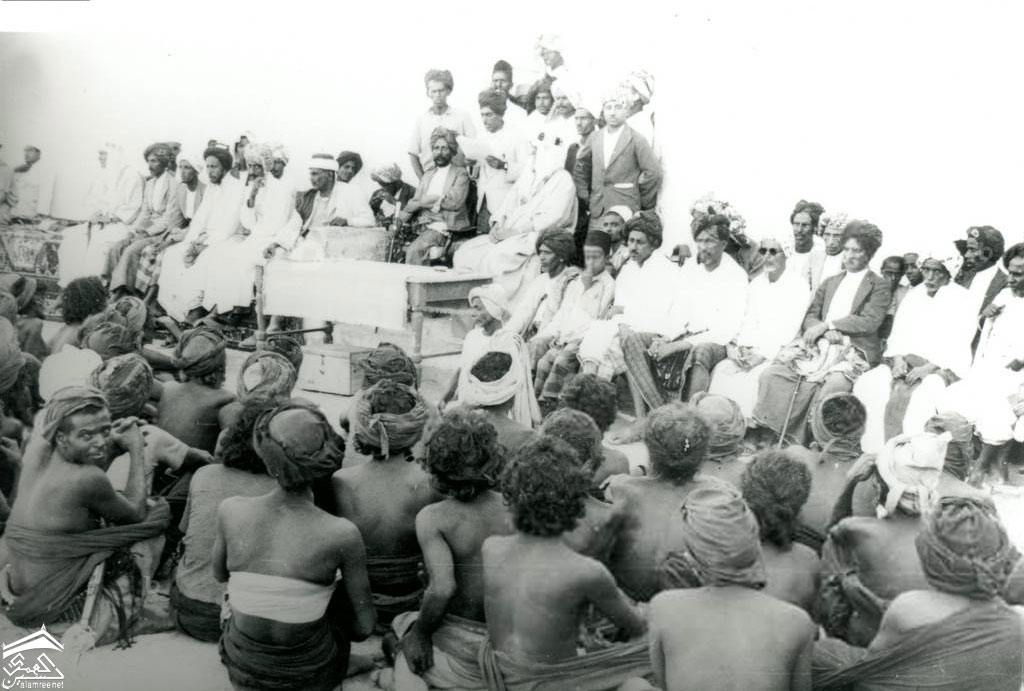 مجموعة من الزعماء يجلسون على المنصة، هارولد إنجرامز يرتدي الزي العربي. تحتهم على الأرض يجلس رجال قبائل شبه عراة