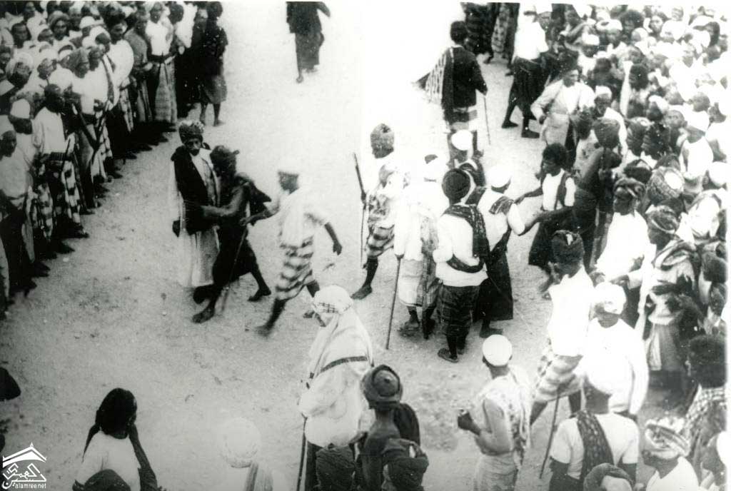مجموعة من الرجال حفاة الأقدام يرتدون الزي اليمني من سترة وفوتا (ملفوفة حول القماش) وبعضهم بالجنبية (خنجر مقوس)
