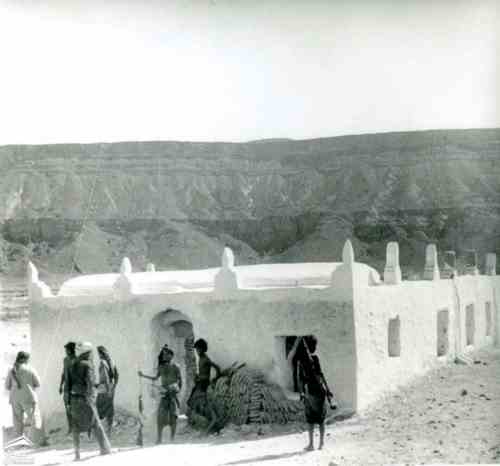 هيكل طويل ومنخفض في منطقة قاحلة، ورجال القبائل عند مدخل المقبرة