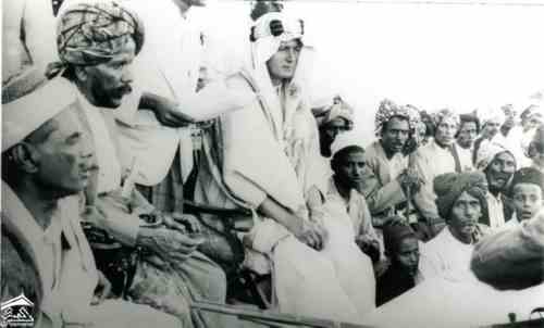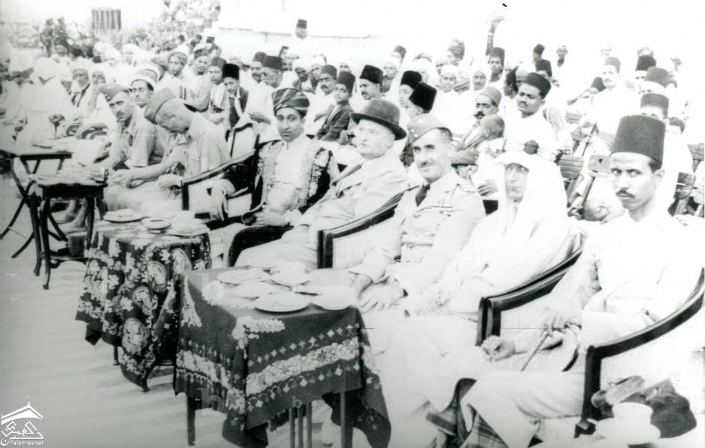 السير صالح بن غالب القعيطي مع كبار الشخصيات الأخرى، أمامهم طاولات شاي صغيرة، وخلفهم حشد من الناس