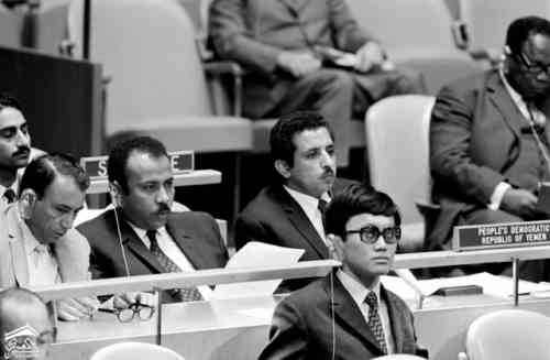 يظهر هنا وفد جمهورية اليمن الديمقراطية الشعبية برئاسة محمد صالح العويقي (يمين) وزير الخارجية. يجلس بجانبه عبد الملك إسماعيل ، المندوب الدائم لدى الأمم المتحدة