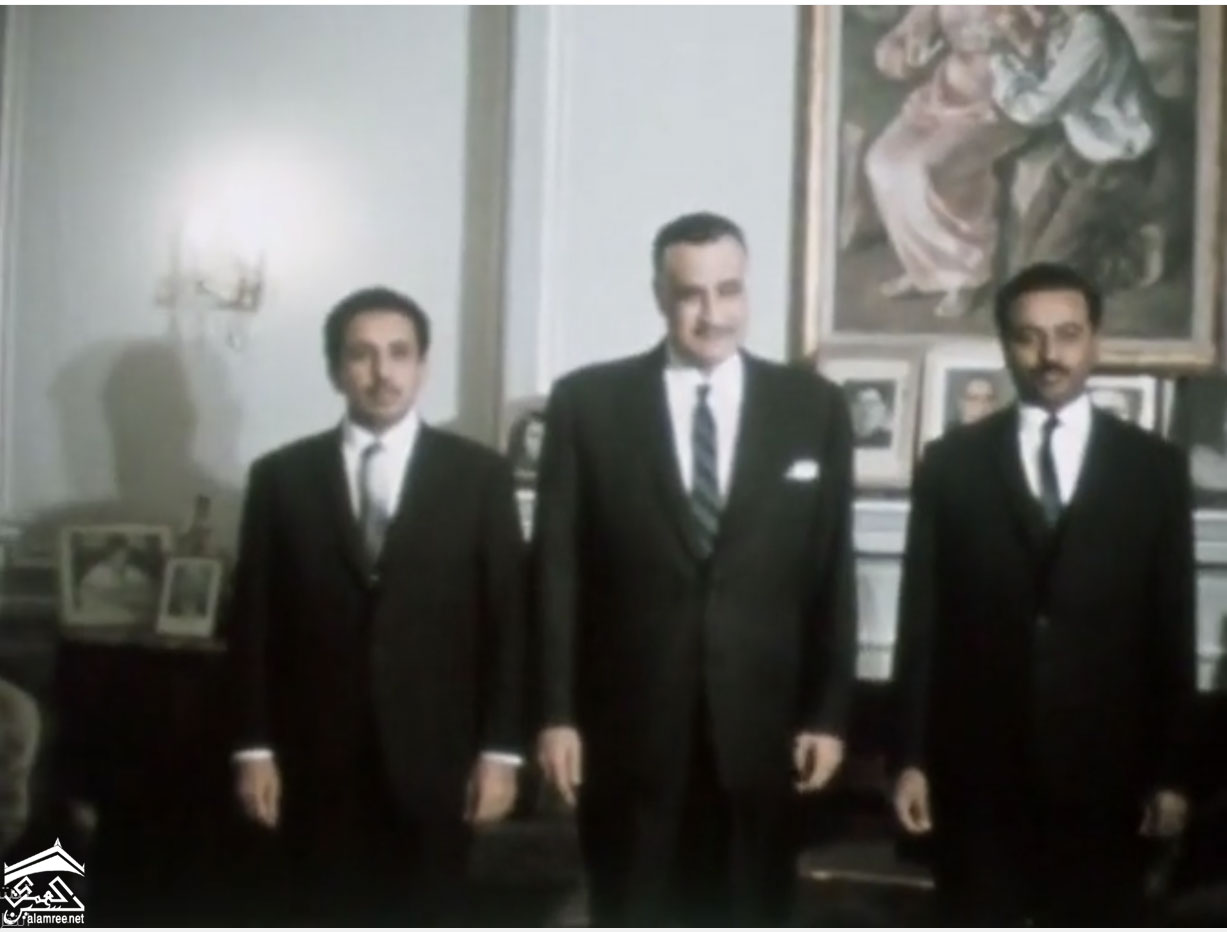 وجمال عبدالناصر وقحكان محمد الشعبي اثناء حفل عشاء تكريماً لرئيس اليمن الجنوبية الشعبية قحطان الشعبى
