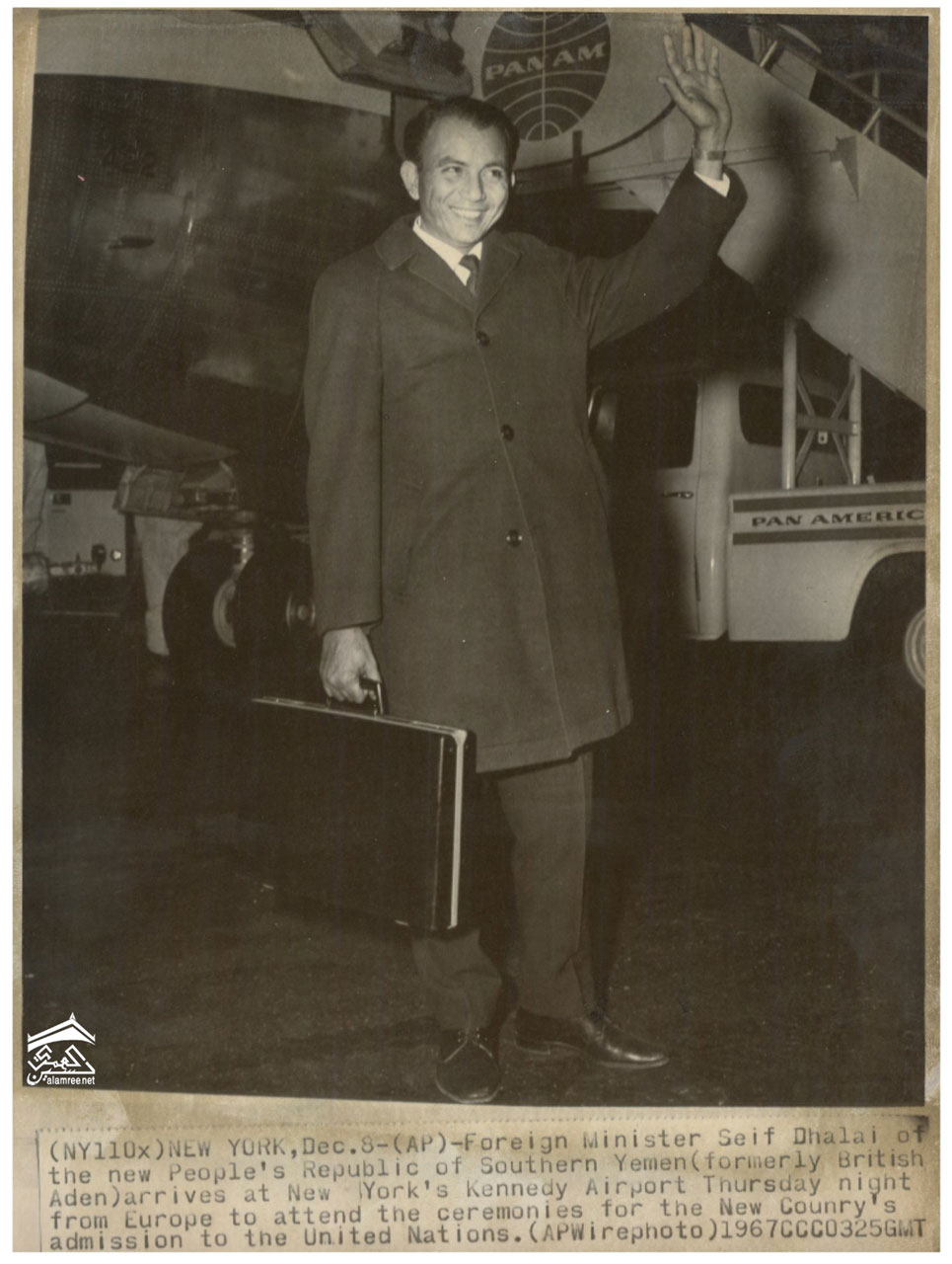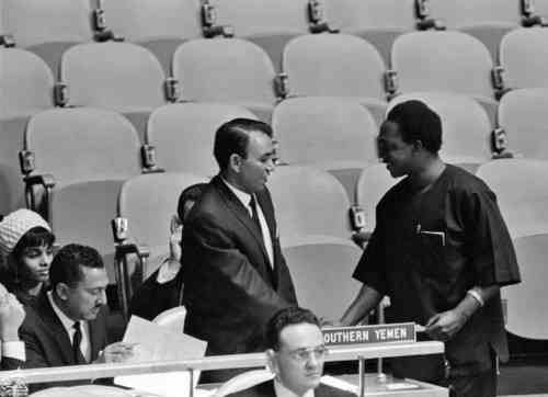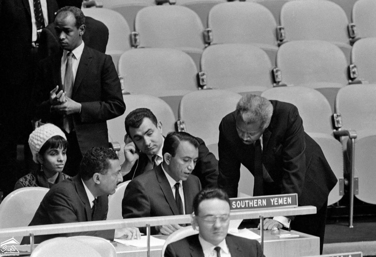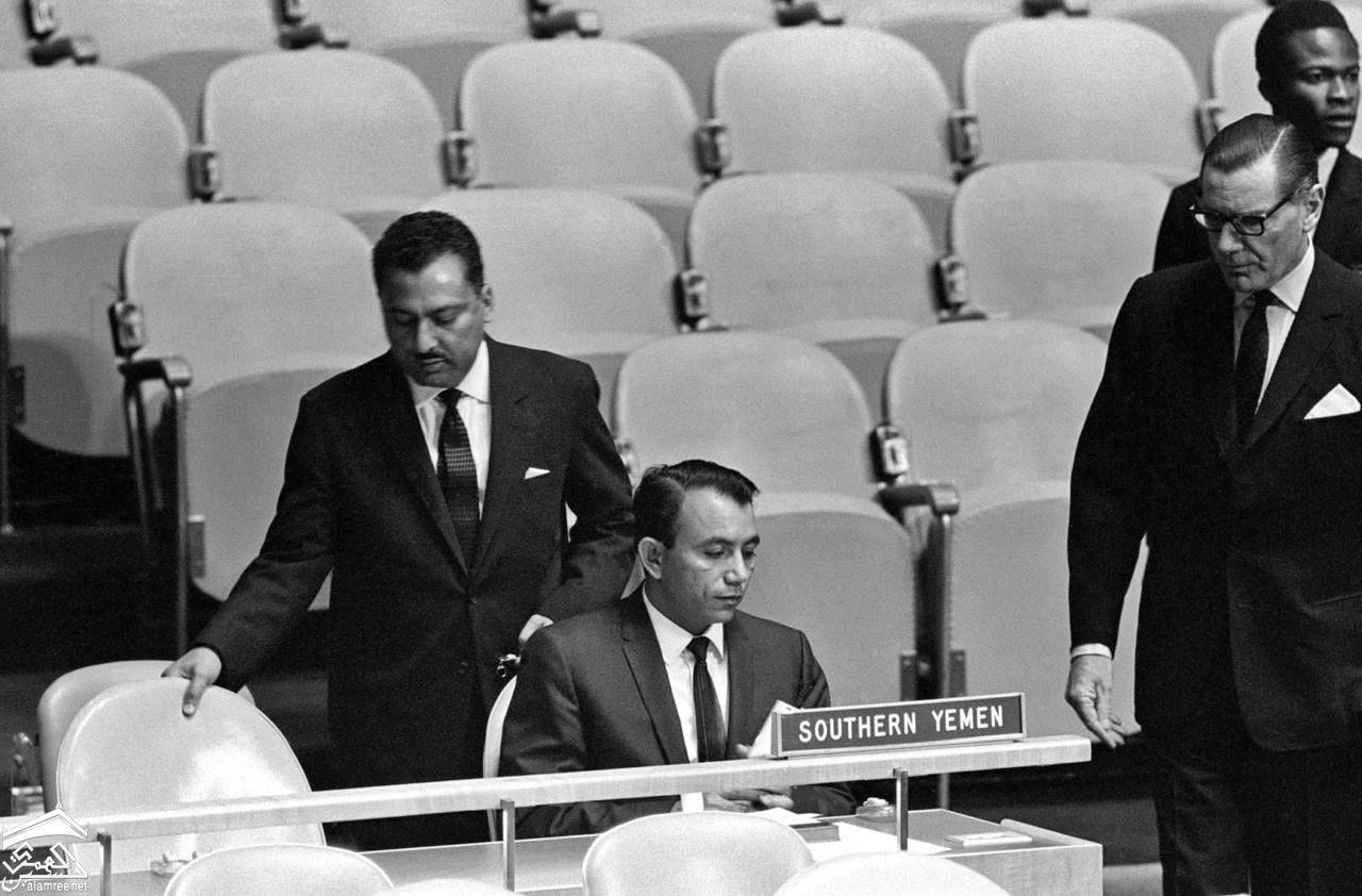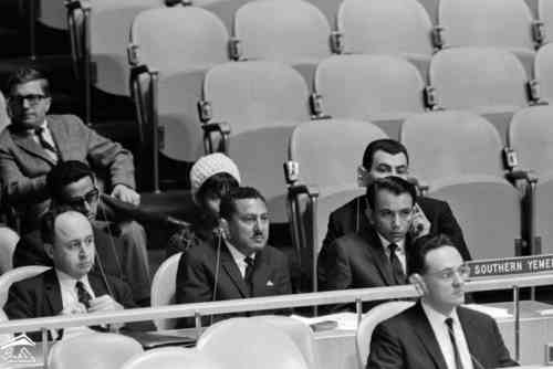يتولى سيف أحمد الضالعي ، وزير خارجية اليمن الجنوبي ، مقعده في الجمعية العامة. وخلفه أحمد علي مساعد ممثل جنوب اليمن. على اليمين ، بيير دي ميولميستر ، رئيس المراسم في الأمم المتحده. |