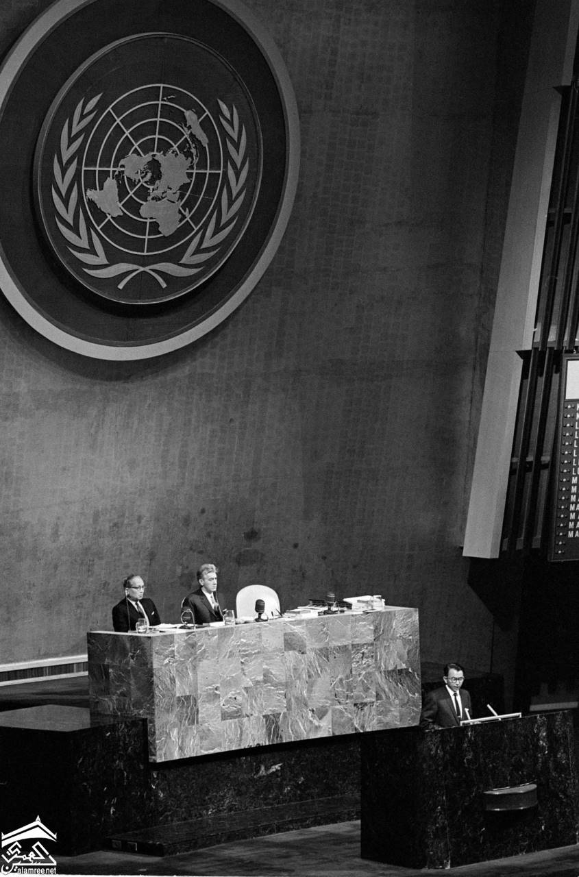 سيف أحمد ضلي ، وزير خارجية اليمن الجنوبي ، يلقي كلمة أمام الأمم المتحدة عقب جلوس وفده في الجمعية العامة. على المنصة ، من اليسار إلى اليمين: الأمين العام للأمم المتحدة يو ثانت وكورنيليو مانيسكو