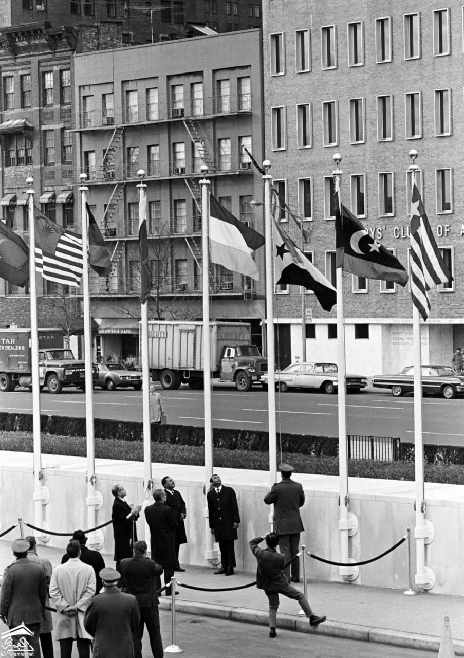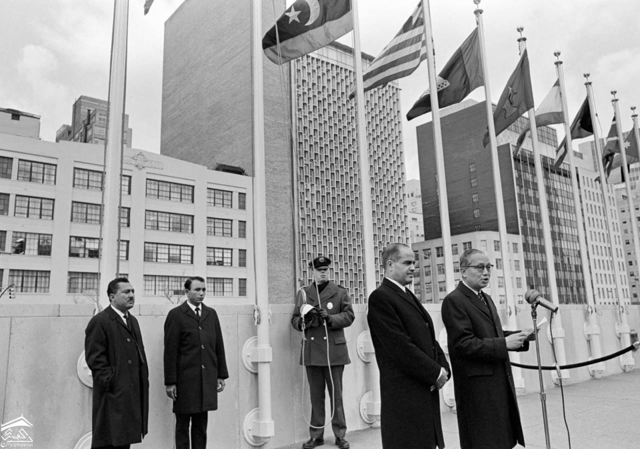 الأمين العام يو ثانت يدلي ببيان قبل مراسم رفع العلم. إلى جانب الأمين العام محمد الفرا ، نائب رئيس الجمعية العامة للأمم المتحدة ، الممثل الدائم للأردن لدى الأمم المتحدة. إلى الخلف ، من اليمين إلى اليسار: سيف أحمد ضلي ، وزير خارجية اليمن الجنوبي ، وأحمد علي مساعد ، ممثل جنوب اليمن. |