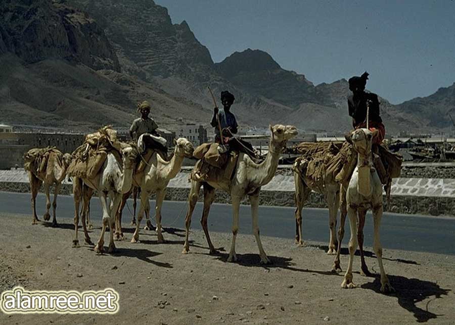 قافله من الجمال في طريقها الى لحج بعد افراغ حمولتها من الحطب لاستخدامه في الطباخه في عدن قبل 70 عاما