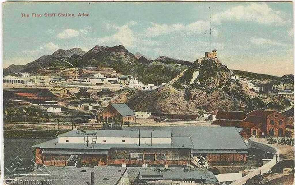 ادارة ميناء عدن وفي الخلفية جبل راس منكل