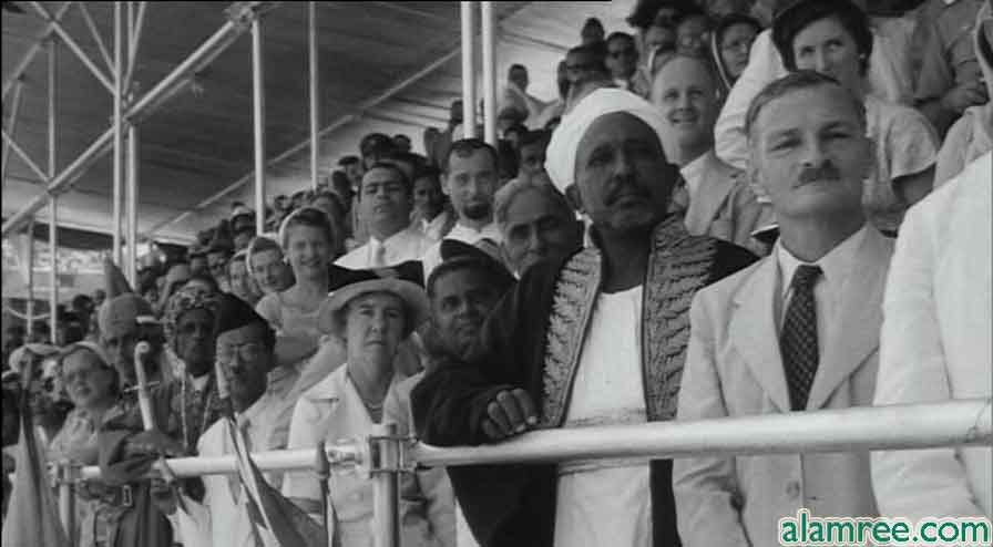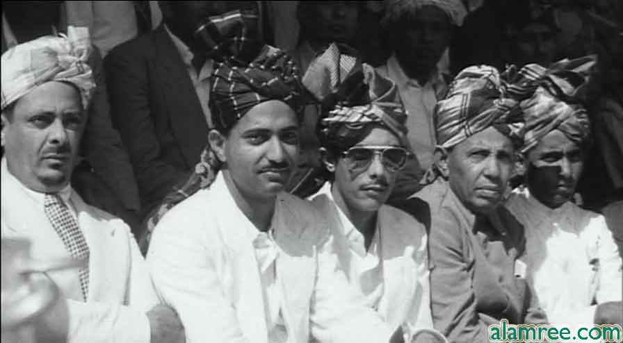 جانب من الحضور من السلاطين وأمراء الجنوب في حفل الاستعراض العسكري الذي اقيم على شرف ملكة بريطانيا اثناء زيارتها لعدن عام 1954م