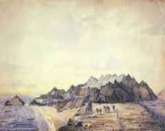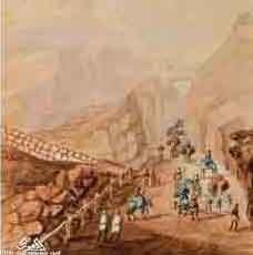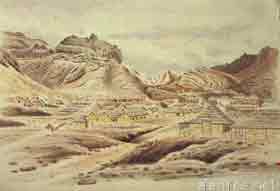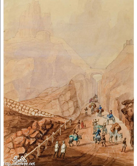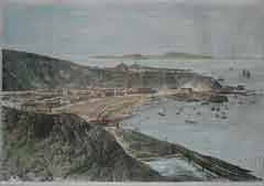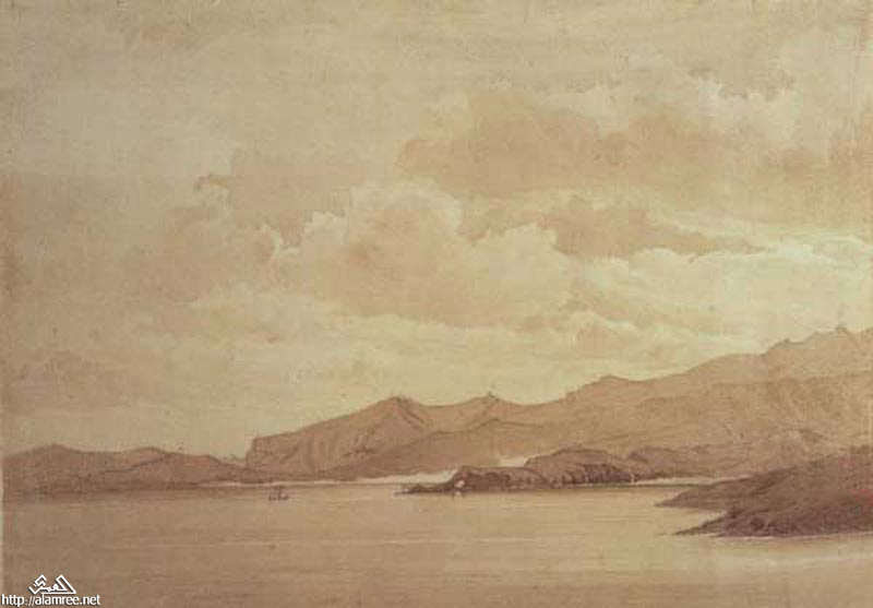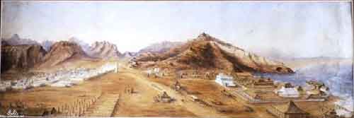 صوره مقربه لجزء من الرسمه لعدن تظهر تفاصيل اكثر عن تحصينات عدن اسفل جبل قلعة صيره