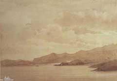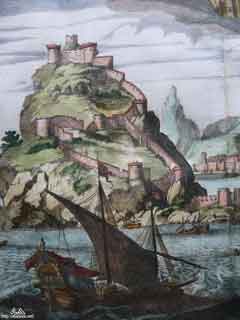 صوره مقربه لجزء من الرسمه لعدن تظهر تفاصيل اكثر عن تحصينات عدن اسفل جبل قلعة صيره |