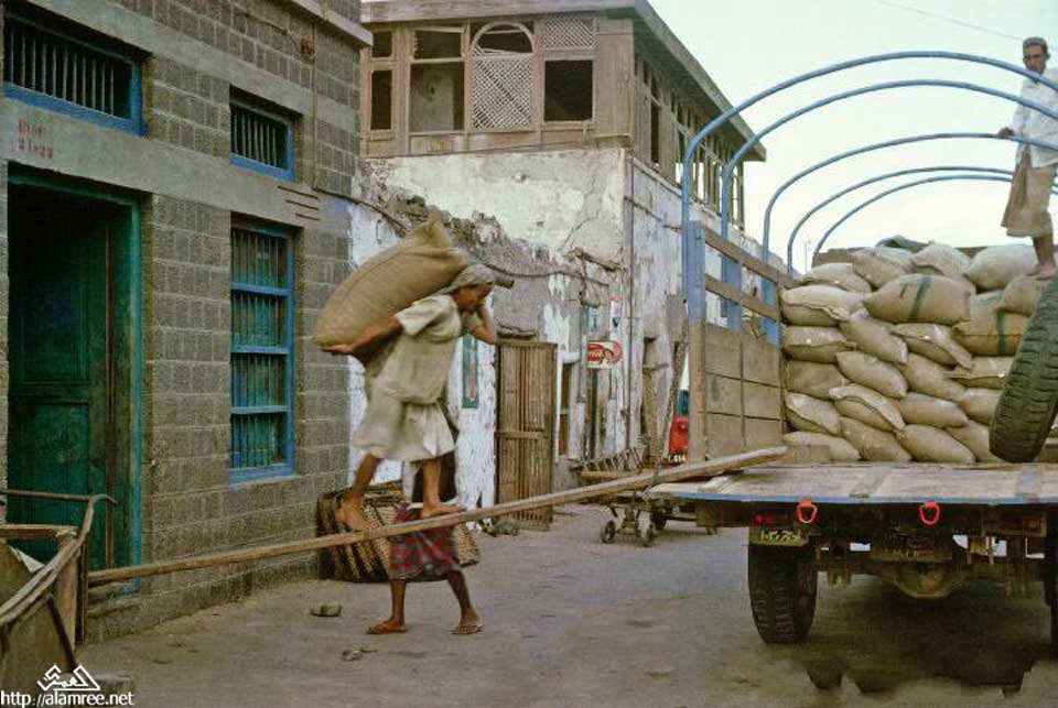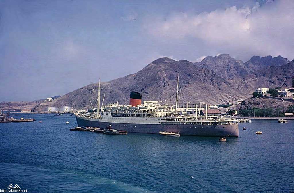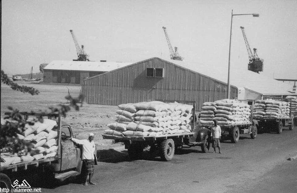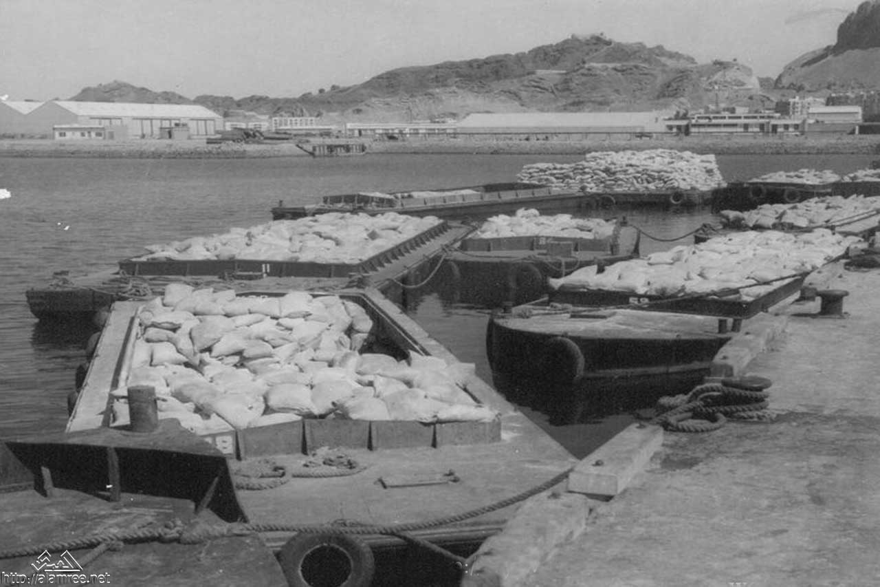 باخرة شحن تجاريه في ميناء عدن تفرغ بضائعها الى صنادل البضائع عام 1963 |