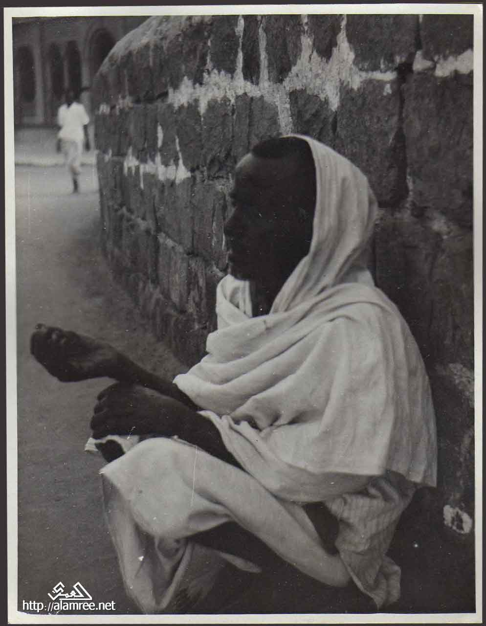 احد المتسولين جالسا على طريق مرور البحاره في التواهي في الاربعينيات