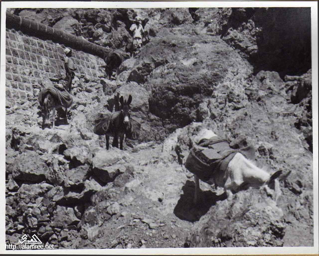 يتم نقل الحجار من الكسارات في اعلى جبال الطويله كريتر عدن عبر الحمير