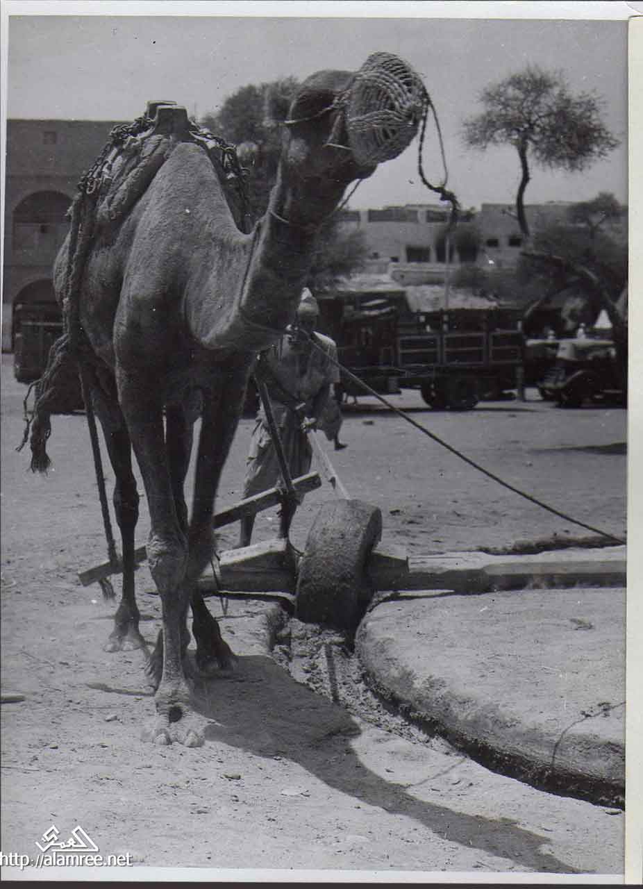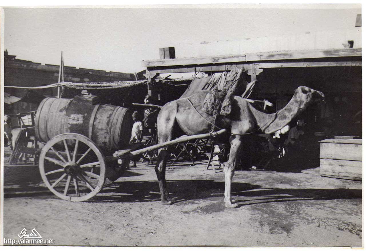 جمل يجر صهريج مليئ بماء الشفه ليوزع بمقابل على المقاهي والمنازل لاستخدامه  كماء للشرب والطهي