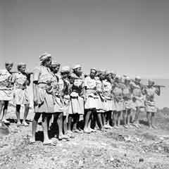 الشرطة المسلحة عدن يسيرون مع الحراب الثابتة.1937 . لاحظ التاثير الهندي ، ممثلة في نمط