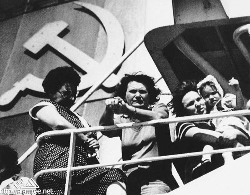 على سلم احدى السفن الروسيه مجموعه من اللاجئين