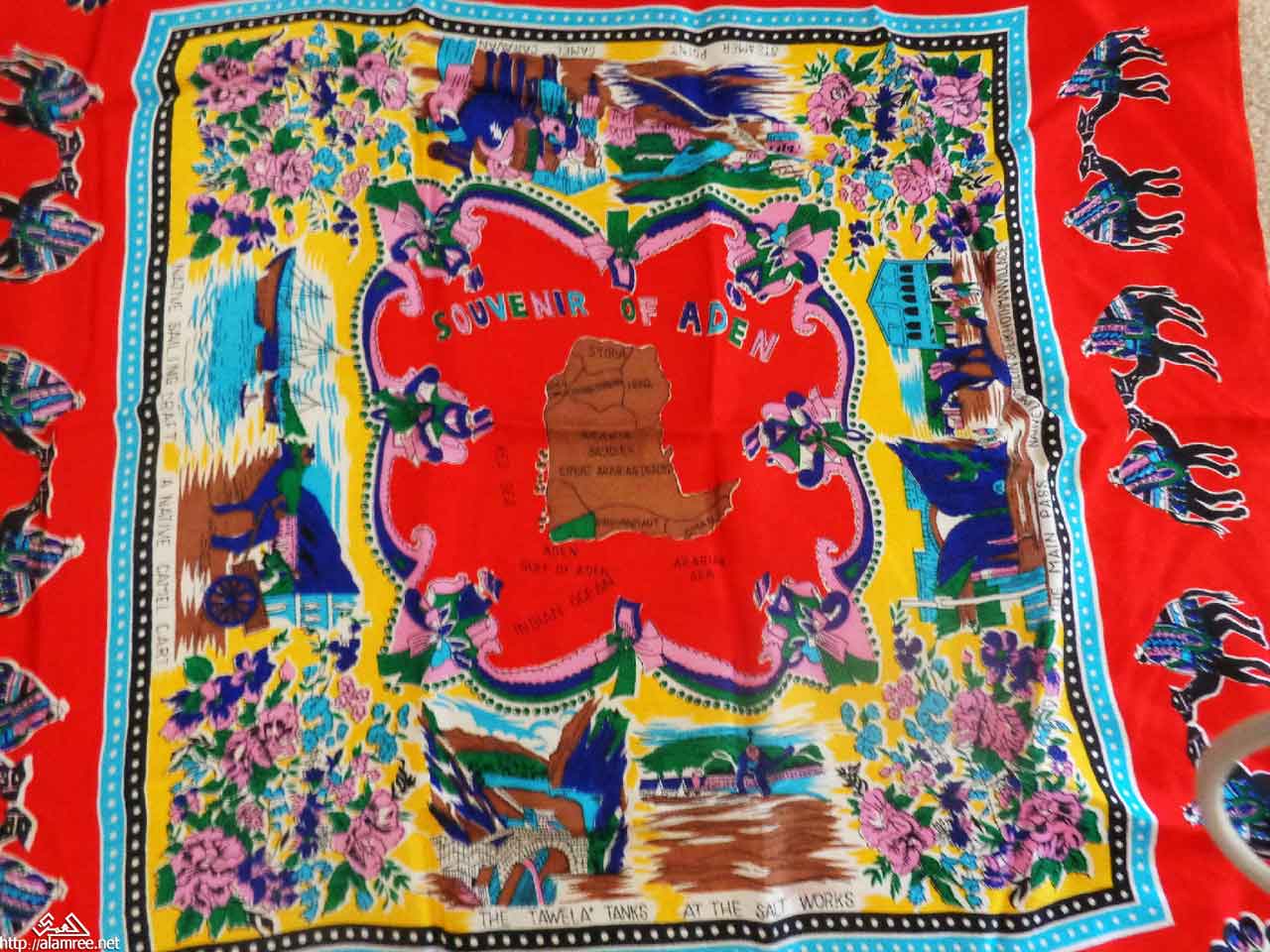 احد المناديل الحريريه وعليه رسومات لمعظم معالم عدن التاريخيه مثل