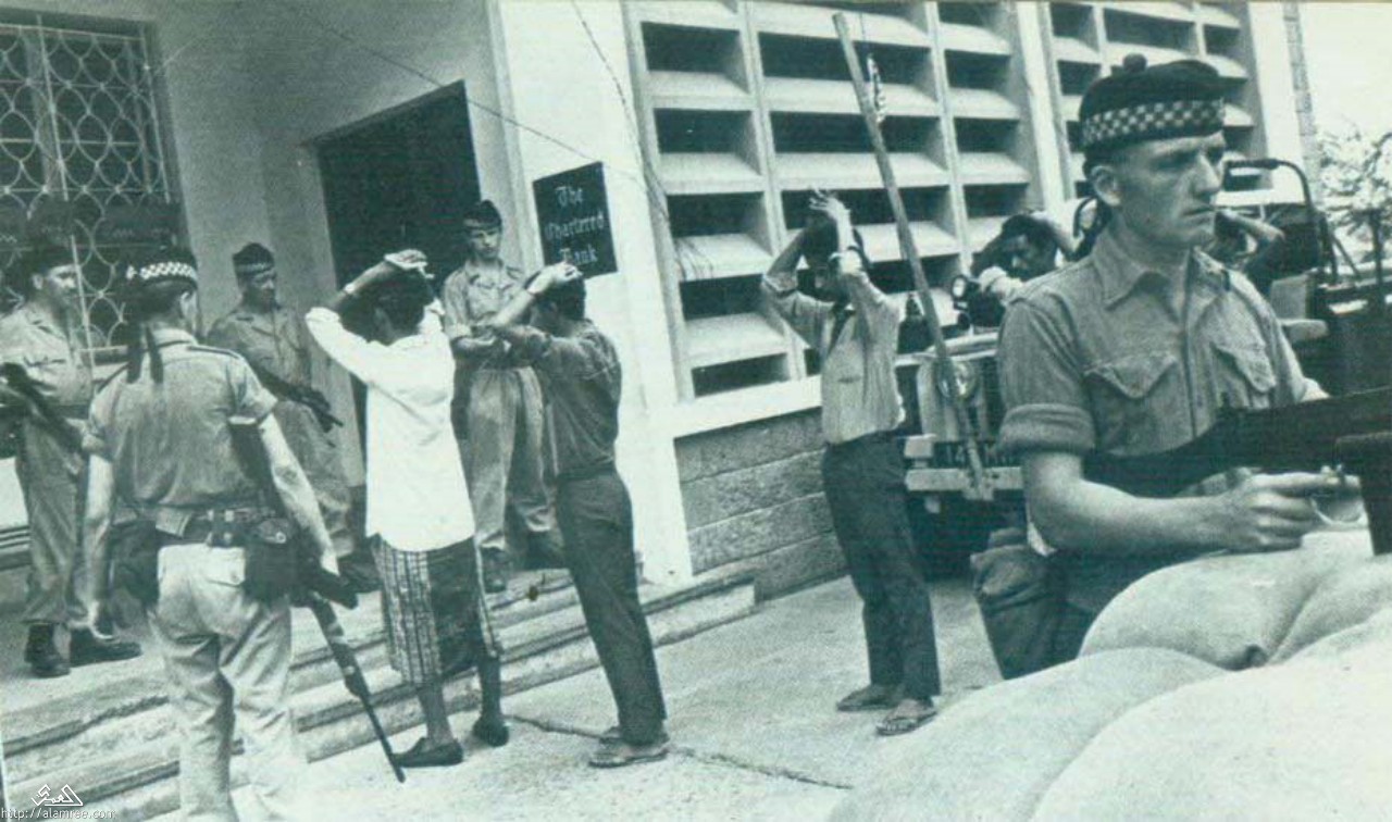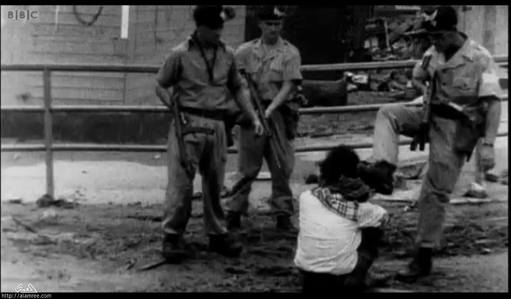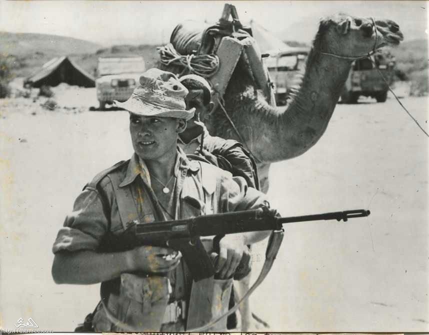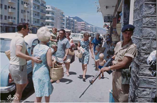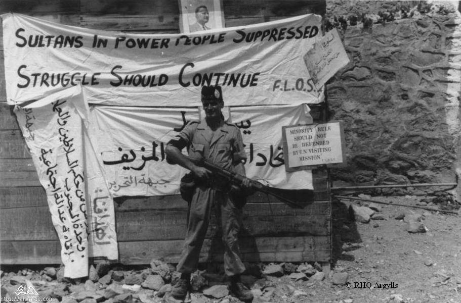 احد الجنود البريطانيين يقف امام شعارات ثوريه لجبهة التحرير في ستينيات القرن الماضي |